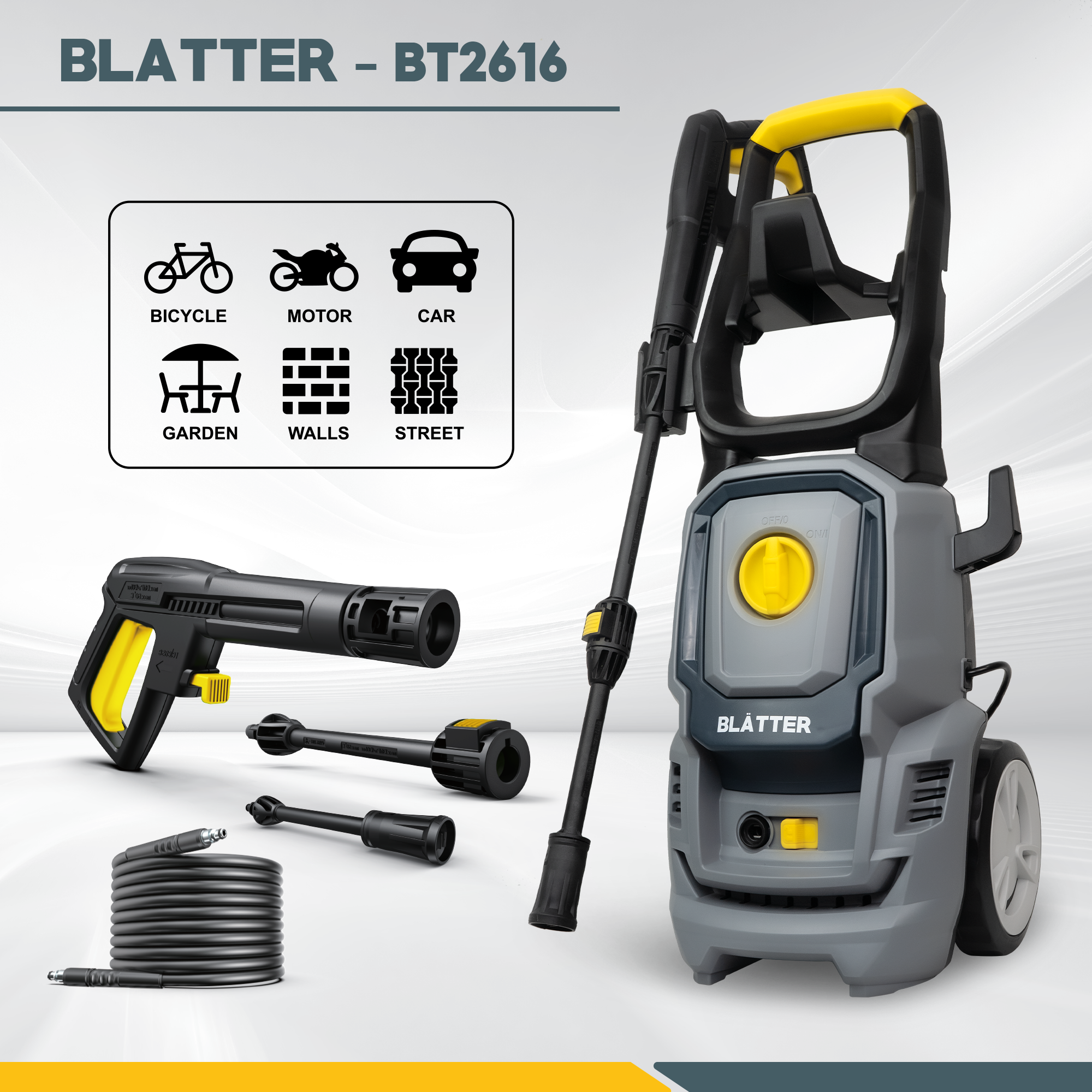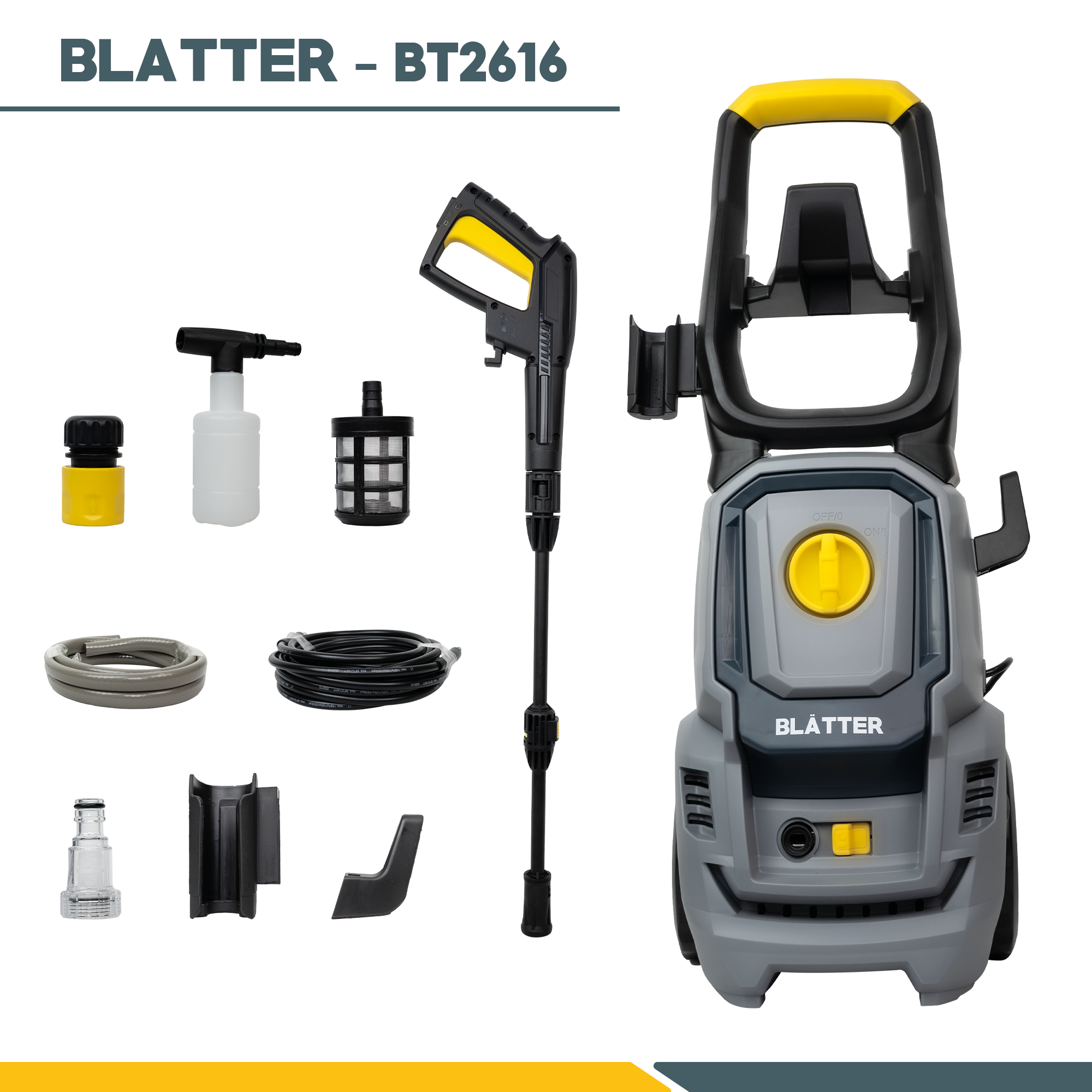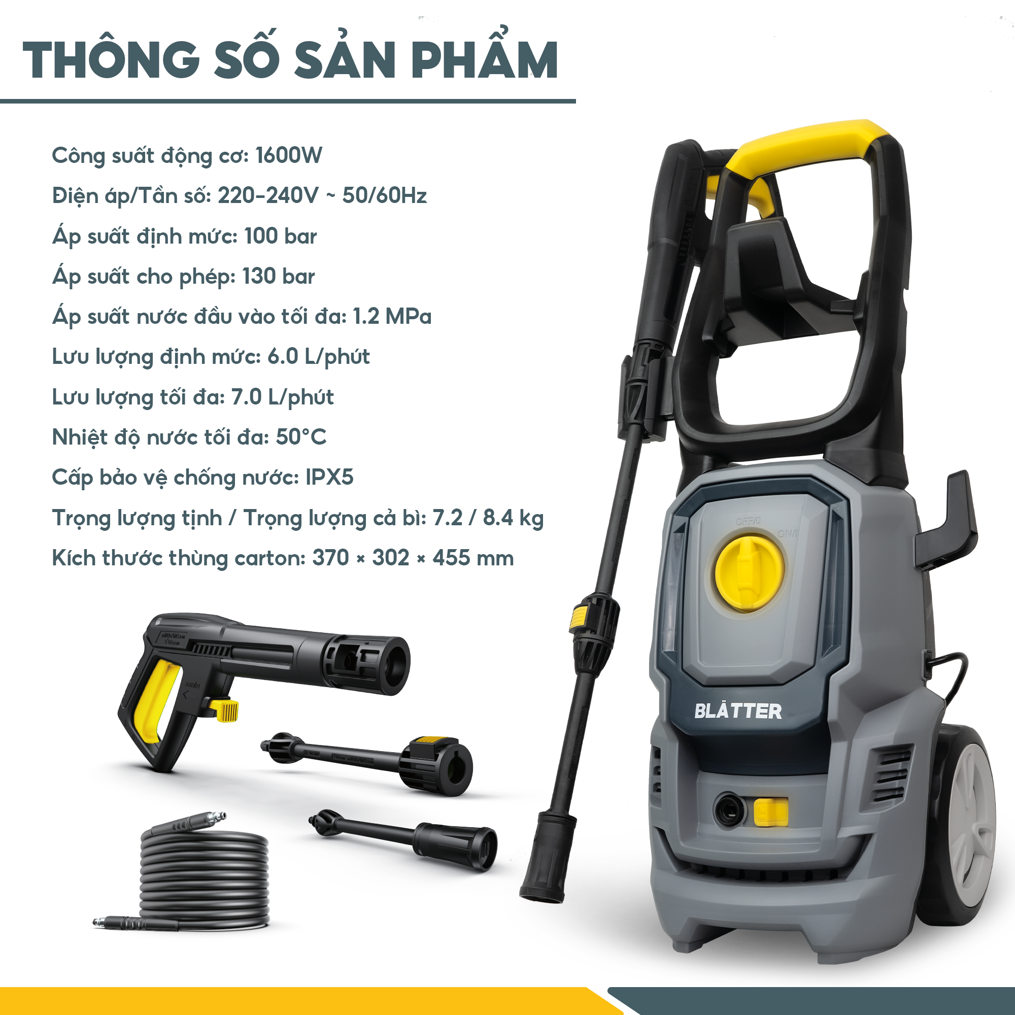 Máy xịt rửa cao áp Blatter BT2616 là dòng máy nâng cấp với hiệu suất mạnh hơn, phù hợp cho nhu cầu vệ sinh gia đình và bán chuyên. Với công suất 1600W – áp lực tối đa 130 bar – lưu lượng nước 7 lít/phút, BT2616 giúp làm sạch nhanh chóng các bề mặt bám bẩn cứng đầu như sân vườn, tường nhà, xe ô tô, xe máy.